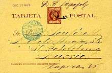 Items of postal stationery with an imprinted stamp are sometimes found with adhesive stamps added to pay for additional services such as airmail, registration or the part transport of mail by a local postal service. Such covers are known as conjunctive covers,[7] and such use is known as a conjunctive use. Placement of the adhesive stamp in addition to the imprinted stamp in order to pay a higher postal rate is called "uprated" (Spanish= franqueos complementarios).[8] This term also applies when an imprinted or embossed stamp is overprinted or handstamped to increase the face value.[2]