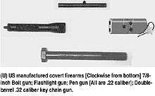 Some more complex improvised firearms are not only well-built, but also use mimicry as camouflage, taking the appearance of other items. Improvised firearms in the form of flashlights, cellular telephones, pens, and large bolts, have all been seized by law enforcement officials. Most of these are .22 caliber rimfires, but flashlight guns have been found ranging from small models firing .22 Long Rifle to larger ones chambered for .410 bore shotgun shells.[9][10]