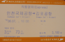 After the opening of the first phase, in 2007, a ticket for a ride from Gimpo International Airport to Incheon International Airport cost ₩3,100, both on commuter and express services.[26] This fare increased in steps to ₩3,500 by the end of 2010,[27] then was reduced to ₩3,300 for commuter trains when the second phase opened.[28] The fare for express services, which travel the full Seoul–Incheon International Airport distance non-stop from the opening of the second phase in December 2010, was set at ₩13,300; while the fare for commuter services on the full distance was set at ₩3,700.[9] This competes against a price of around ₩10,000 on buses, ₩67,500 on taxis, and about ₩15,500 with private car.[9]