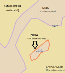 The India–Bangladesh enclaves, also known as the chitmahals (Bengali: ছিটমহল chitmôhol) and sometimes called pasha enclaves,[1] were the enclaves along the Bangladesh–India border, in Bangladesh and the Indian states of West Bengal, Tripura, Assam and Meghalaya. Within the main body of Bangladesh were 102 enclaves of Indian territory, which in turn contained 21 Bangladeshi counter-enclaves, one of which contained an Indian counter-counter-enclave – the world's only third-order enclave. Within the Indian mainland were 71 Bangladeshi enclaves, containing 3 Indian counter-enclaves. A joint census in 2010 found 51,549 people residing in these enclaves: 37,334 in Indian enclaves within Bangladesh and 14,215 in Bangladeshi enclaves within India.[2][3]