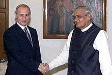 The first major political initiative, since the collapse of the Soviet Union, between India and Russia began with the Strategic Partnership signed between the two countries in 2000. President Vladimir Putin stated in an article written by him in the Hindu, "The Declaration on Strategic Partnership between India and Russia signed in October 2000 became a truly historic step".[19][20] Former Prime Minister Manmohan Singh also agreed with his counterpart by stated in speech given during President Putin's 2012 visit to India, "President Putin is a valued friend of India and the original architect of the India-Russia strategic partnership".[21] Both countries closely collaborate on matters of shared national interest these include at the UN, BRICS, G20 and SCO where India has observer status and has been asked by Russia to become a full member.[9] Russia also strongly supports India receiving a permanent seat on the United Nations Security Council.[10] In addition, Russia has vocally backed India joining the NSG[22] and APEC.[23] Moreover, it has also expressed interest in joining SAARC with observer status in which India is a founding member.[12][24]