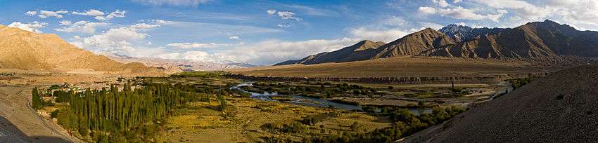 Confluence of Indus and Zanskar rivers. The Indus is at the bottom of the picture, flowing left-to-right; the Zanskar, carrying more water, comes in from the middle left of the picture.