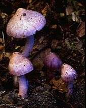 The variety lilacina is similar in shape but tinted lilac all over, with an ochre-brown flush on the cap umbo and the base of the stem. It has a strong mealy or earthy odour.[2] This variety could be mistaken for the edible amethyst deceiver (Laccaria amethystina), although the latter species has a fibrous stipe, a fruity smell and lacks the ochre-coloured umbo.[4]