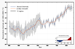 - ↑ Brohan, P., J.J. Kennedy, I. Harris, S.F.B. Tett, P.D. Jones (2006). "Uncertainty estimates in regional and global observed temperature changes: a new dataset from 1850". J. Geophys. Res. 111: D12106. Bibcode:2006JGRD..11112106B. doi:10.1029/2005JD006548.