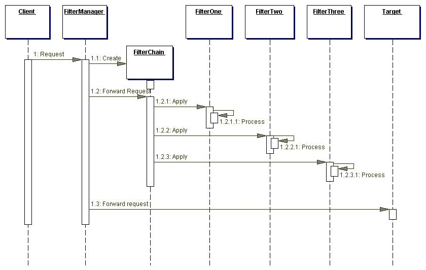 Filter manager, filter chain, filters and target are components of the pattern.
