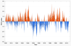 The Pacific Decadal Oscillation index is the leading empirical orthogonal function (EOF) of monthly sea surface temperature anomalies (SST-A) over the North Pacific (poleward of 20° N) after the global average sea surface temperature has been removed. This PDO index is the standardized principal component time series.[2] A PDO 'signal' has been reconstructed to 1661 through tree-ring chronologies in the Baja California area.[3]