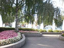 One of the first sights seen on entering the park is a large flowerbed representing the Canadian flag. The bed is empty during the park's first weeks of being open and is replaced with a faux graveyard during the autumn. Approximately 11,000 begonias are planted in the bed, which is 80 feet (24 m) by 50 feet (15 m) in size.[3] Behind it is a large fountain area, with a variety of water patterns all day and lighting effects at night. A pathway structure, modeled to look like an arch bridge, contained (as of 1982) a computer that controlled the fountain's 93 pneumatic valves and nozzles and its 504 red, white, and turquoise lights.[2] In 1982, the lighting patterns would change roughly every 30 seconds, with a 30-minute rotation.[2] In 2011, the lights were upgraded to offer a range of 16 million colours.[4] Before the park opened, the 300-foot (91 m) by 80-foot (24 m) water basin was referred to as Royal Fountain.[5]