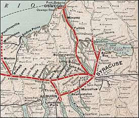 The rail was part of the Beebe Syndicate, a group of 12 high-speed, interurban, electric train lines which ran from Buffalo, New York, through Rochester and Syracuse, then north to Oswego on Lake Ontario.[30]