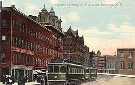 The Syracuse Rapid Transit Railway, an interurban rail, began operations in May 1896. The company was a consolidation of the Syracuse Street Railroad Company, the Syracuse Consolidated Street Railway Company and the People's Railroad Company[8] that was called the Syracuse Railway Company.[24]