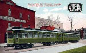 The rail was part of the Beebe Syndicate, a group of 12 high-speed, interurban, electric train lines which ran from Buffalo, New York, through Rochester and Syracuse, then north to Oswego on Lake Ontario.[30] The line had an "electric parlor car" named Syracuse in 1912 that made runs between Syracuse and Rochester.