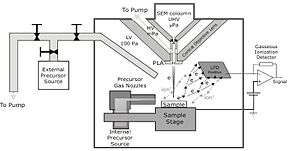 - Deposition occurs in a focused ion beam (FIB) setup, which strongly limits characterization of the deposit during or right after the deposition. Only SEM-like imaging using secondary electrons is possible, and even that imaging is restricted to short observations due to sample damaging by the Ga+ beam. The use of a dual beam instrument, that combines a FIB and an SEM in one, circumvents this limitation.