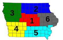 | 6 | Cedar Rapids | Benton, Buchanan, Cedar, Clinton, Delaware, Dubuque, Iowa, Jackson, Johnson, Jones, Linn, and Scott[17] |