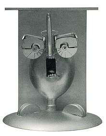 Hünerfauth began her her career as a figurative painter, but even her early work features much originality, bold and unexpected perspectives and an unusual coloration. The art critic Franz Roh said that she did neither concentrate on a picturesque tachism nor on graphically linear constructivism, she should be understood between those. Her style of painting was a "highly individual crossing of tranquillity and mobility in the picture".[6] She was anxious to transcend the conventional by experimenting with unusual tools, for example as she used a dentist's drill for a series of drypoint etchings. Her teacher Conrad Westphal, a significant representative and internationally renowned artist of the informal arts, first formed her as an abstract painter. She advanced her mixed media technique with collages and appilactions from different materials. Next she started to tinker and construct and since then worked three- dimensionally only. The following realized objects (scrap sculptures, panel pictures, etc.) connected her work with the Nouveaux Realistes group. Niki de Saint Phalle, Jean Tinguely, Arman and Daniel Spoerri were also renowned members of this group of artists.[7] Hünerfauth always titled her work with the term IRMAnipulations, a word creation which was invented during an exhibition at the Goethe Institut in London in 1983 and kept by the artist as a kind of trademark. One of the most important retrospective exhibitions of her oeuvre titled "Irma Hünerfauth – IRMAnipulations" was held from 3 August until 2 September 1990 in the townhall of Munich.