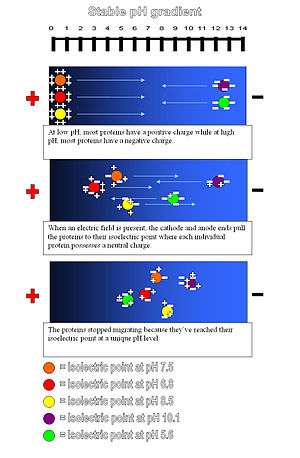 Molecules to be focused are distributed over a medium that has a pH gradient (usually created by aliphatic ampholytes). An electric current is passed through the medium, creating a "positive" anode and "negative" cathode end. Negatively charged molecules migrate through the pH gradient in the medium toward the "positive" end while positively charged molecules move toward the "negative" end. As a particle moves towards the pole opposite of its charge it moves through the changing pH gradient until it reaches a point in which the pH of that molecules isoelectric point is reached. At this point the molecule no longer has a net electric charge (due to the protonation or deprotonation of the associated functional groups) and as such will not proceed any further within the gel. The gradient is established before adding the particles of interest by first subjecting a solution of small molecules such as polyampholytes with varying pI values to electrophoresis.