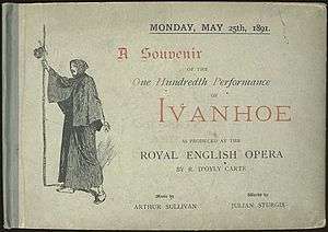 Ivanhoe is a romantic opera in three acts based on the novel by Sir Walter Scott, with music by Sir Arthur Sullivan and a libretto by Julian Sturgis. It premiered at the Royal English Opera House on 31 January 1891 for a consecutive run of 155 performances, unheard of for a grand opera.[1] Later that year it was performed six more times, making a total of 161 performances.[2]
