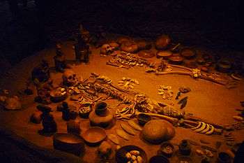 The Shaft Tomb Tradition (500 BCE - 500 CE) constitutes a peculiar feature of mesoamerican prehispanic development in México, although there are analog burials forms elsewhere in the continent. Shaft Tombs thus far discovered in the Nayarit territory, were found and excavated outside of the settlement sites of that epoch, in vertical shafts (Wells), with one or two chambers where their dead were placed together with human and animal sculptures, also with large vessels that contained funerary offerings, these reflect the development achieved by this tradition, with the particular regional characteristics found.[2]