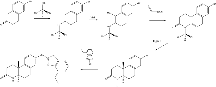The scheme used to produce a somewhat more complex 5-a-reductase inhibitor relies on a chiral auxiliary to yield the final product as a single enantiomer. The first step starts with the reaction of bromotetralone with R-α-phenethylamine to afford the enamine. Reaction with methyl iodide adds the methyl group at what will be a steroid-like AB ring junction.