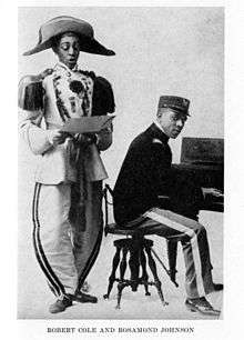 Johnson was trained at the New England Conservatory and then studied in London. His career began as an interesting public school teacher in his hometown of Jacksonville, Florida. Travelling to New York, he began his show business career along with his brother and Bob Cole. As a songwriting team, they wrote works such as The Evolution of Ragtime (1903). Among the earliest works by the group, this was a suite of six songs of "Negro" music. They produced two successful Broadway operettas with casts of black actors: Shoo-Fly Regiment of 1906 and The Red Moon of 1908.[4][5][6] Johnson also performed in them. He played a Tuskegee soldier that enlists in the Spanish American War in The Shoo Fly Regiment and portrayed African American Plunk Green opposite Abbie Mitchell’s Minnehaha, a mixed Indian/black woman, in The Red Moon. [7] These performances went beyond theatre. Rosamund, alongside his brother and Cole, evoked a political presence in their inclusion of other races in their musicals.[8] In The Red Moon, Cole and Johnson broke racial lines as they included a love scene between Rosamund’s Green and Mitchell’s Minnehaha. This spotlight on Native Americans was so well received that Rosamund was inducted as a ‘sub-chief’ into the Iroquois tribe of Montreal’s Caugnawago Reservation.[9]