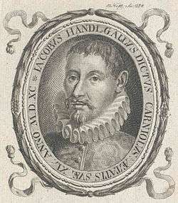 Jacobus Gallus Carniolus (a.k.a. Jacob(us) Handl, Jacob(us) Händl, Jacob(us) Gallus; Slovene: Jakob Petelin Kranjski) (3 July 1550 – 18 July 1591) was a late-Renaissance composer of Slovene[1] ethnicity. Born in Carniola, which at the time was one of the Habsburg lands in the Holy Roman Empire, he lived and worked in Moravia and Bohemia during the last decade of his life.