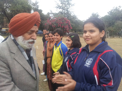 - Jaipal Singh, Director Youth Services and Sports interacting with the players and officials of J&K girls team during the semifinal match at Jammu University ground on Friday.