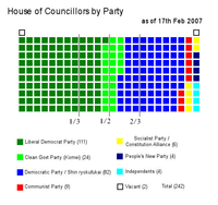 The 21st Elections to the House of Councillors (第21回参議院議員通常選挙 Dainijūikkai Sangiingiin Tsūjōsenkyo) for the upper house of the legislature of Japan were held on July 29, 2007.[1][2] The date was originally to be July 22, but the ruling Liberal Democratic Party (LDP) decided in mid-June to extend the session of the House for a week to finish up legislative business; this step was criticised due to the short-term delay.[3]