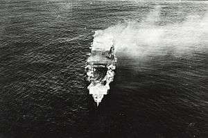 While VT-3 was still attacking Hiryū, American dive bombers arrived over the Japanese carriers almost undetected and began their dives. It was at this time, around 10:20, that in the words of Jonathan Parshall and Anthony Tully, the "Japanese air defenses would finally and catastrophically fail."[54] Three American dive bomber squadrons now attacked the three other carriers and set each of them on fire.[55] Hiryū was untouched and proceeded to launch 18 D3As, escorted by 6 Zeros, at 10:54 and a second wave of 10 B5Ns, escorted by 6 Zeros, at 13:30 against the American carrier Yorktown. En route, the Zeros engaged a group of Enterprise's Dauntlesses that they had spotted. They failed to shoot down any of the dive bombers, but two of the Zero were shot up by the bombers' rear gunners, with one Zero forced to ditch near a destroyer. American radar detected the incoming Japanese dive bombers at 11:52 and vectored Yorktown's CAP of 20 Wildcats against them. The Wildcats shot down three of the remaining Zeros for the loss of one of their own and engaged the D3As. Only seven of the dive bombers survived long enough to make their attack on Yorktown and two of those were shot down by flak during their dive, but they made three direct hits and two near misses that badly damaged the carrier and set her on fire.[56]