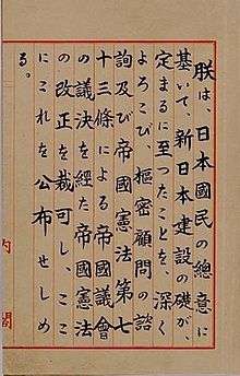 - "I rejoice that the foundation for the construction of a new Japan has been laid according to the will of the Japanese people, and hereby sanction and promulgate the amendments of the Imperial Japanese Constitution effected following the consultation with the Privy Council and the decision of the Imperial Diet made in accordance with Article 73 of the said Constitution."[8][9]