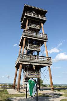 The Joseph N. Nicollet Tower and Interpretive Center, a monument to Nicollet and his work, was constructed by Kyburz-Carlson Construction Co. in 1991 in Sisseton, South Dakota, near the path Nicollet took from Devil's Lake back to Fort Snelling on his final expedition.[1][4] Banker and Sisseton resident Harold Torness became fascinated with Nicollet's story and work after reading Joseph N. Nicollet on the Plains and Prairies, a translation of Nicollet's journals, and raised $335,000 from just seven local donors in order to build the monument.[4][10] The tower is constructed primarily of Douglas-fir from Idaho, with concrete pillars and steel bolts and supports. It is 80 feet tall at its peak, and there are 96 steps to the top observation platform. Six counties in three states (South Dakota, North Dakota, and Minnesota) can be seen from the top, where there is a view of the Laurentian Divide, the Coteau des Prairies and the ancient glacial valley that Nicollet mapped.[4][10] The Interpretive Center was constructed at the same time as the tower. Both the tower and the Interpretive Center were designed by Clarence Herges and were built by Kyburz-Calrson Construction.[10] The Interpretive Center houses 2,400 square feet of classroom space and exhibits, including Nicollet's map and a mural of Nicollet's meeting with Wanata, chief of the Yankton Dakota.[1][4]