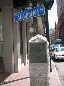 The southern terminus of the Jefferson Highway was in New Orleans, Louisiana at the intersection of St. Charles Avenue and Common Street.[1] It is marked by a six-foot tall Georgia granite obelisk donated by the New Orleans chapter of the Daughters of the American Revolution. The obelisk was installed on April 15, 1918,[2] and it was formally dedicated the following January.[3]