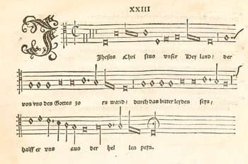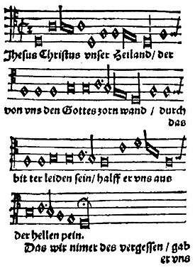 The earliest extant copy of "Jesus Christus nostra salus" (text and melody) is found in southern Bohemia, 1410.[2][6] The earliest extant prints of Luther's hymn (both editions of the Erfurt Enchiridion and Johann Walter's choral hymnal Eyn geystlich Gesangk Buchleyn) originated in 1524.[3] Later versions approved by Luther (since he wrote the foreword to these editions) are contained in the Klug'sche Gesangbuch (1529/1533) and the Babstsches Gesangbuch (1545).[2][6]