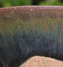 Jian ware is a type of Chinese pottery originally made in Jianyang, Fujian province.[2] It is known in Japan as Tenmoku (天目). The wares are simple shapes in stoneware, with a strong emphasis on subtle effects in the glazes. In the Song dynasty they achieved a high prestige, especially among Buddhist monks and in relation to tea-drinking. They were also highly valued in Japan, where many of the best examples were collected. Though the ceramic body is light-coloured, the wares, generally small cups for tea, bowls and vases, normally are glazed in dark colours, with special effects such as the "hare's fur" "oil-spot" and "partridge feather" patterns caused randomly as excess iron in the glaze is forced out during firing.
