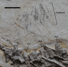 The impressions of a series of wide and unbranched feathers were discovered with the fossils. Only the distal ends of the feather impressions are visible. Based on their morphology the feathers are considered primitive and bear resemblance to those found along the neck of Beipiaosaurus, which were collected in the same formation. The authors noted that the "presence of elongated broad filamentous feathers (EBFF) suggests that they might have been used for visual display".[1]