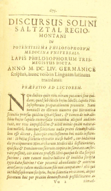 - ↑ Smith, Pamela H. (2016). The Business of Alchemy: Science and Culture in the Holy Roman Empire. Princeton: Princeton University Press. ISBN 9780691173238, p. 40/41; see also: 'The Emperor's Mercantile Alchemist' in: Greenberg, Arthur (2006) - From Alchemy to Chemistry in Picture and Story. Hoboken N.J. : John Wiley & Sons. ISBN 978 0 470 08523 3. p. 231f. Chisholm writes in the 11th. ed. of the Encyclopædia Britannica that Becher “published an edition of Salzthal’s Tractatus de lapide trismegisto.”