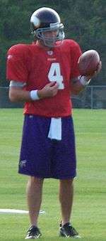 Booty broke from convention and stated on a national television broadcast, more than a week before the NFL draft, that he hoped to be selected by the Minnesota Vikings.[24] He was drafted by the Vikings in the fifth round (137th overall) of the 2008 NFL Draft. Booty made the team after a pre-season battle for the third spot on the depth chart with Brooks Bollinger. He did not take a snap in 2008, but after starter Gus Frerotte went down with a lower back injury, Booty was listed as the second string quarterback during the week 15 meeting with the Arizona Cardinals and Tarvaris Jackson made the start.