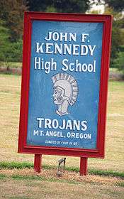 John F. Kennedy High School is a public school located in Mt. Angel, Oregon, United States, as part of the Mt. Angel School District.[4] The school was originally Mt. Angel Preparatory School run by the Benedictine monks of Mount Angel Abbey, and was founded in 1887.[5] The Benedicitnes ran the school until 1964, when they turned administration of it over to St. Mary's Catholic Church, located in Mt. Angel. The parish ran the school for five years until closing it down in 1969.[6] It was reopened one year later as John F. Kennedy High School,and remains so today.