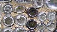 Most of the bottles came from his bottling plant as the bottom of the bottles reveal. There is a large variety of bottles that were used for many products, including drinks, wine, beer, and liqueur. The bottles were not only round, but oblong in shape as well. The bottles are arranged with clear bottles and brown color bottles on the front of the house to spell "HAPPY HOME."