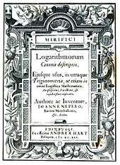 His work, Mirifici Logarithmorum Canonis Descriptio (1614) contained fifty-seven pages of explanatory matter and ninety pages of tables of numbers related to natural logarithms (see Napierian logarithm). The book also has an excellent discussion of theorems in spherical trigonometry, usually known as Napier's Rules of Circular Parts. Modern English translations of both Napier's books on logarithms, and their description can be found on the web, as well as a discussion of Napier's Bones (see below) and Promptuary (another early calculating device).[4] His invention of logarithms was quickly taken up at Gresham College, and prominent English mathematician Henry Briggs visited Napier in 1615. Among the matters they discussed were a re-scaling of Napier's logarithms, in which the presence of the mathematical constant e (more accurately, e times a large power of 10 rounded to an integer) was a practical difficulty. Napier delegated to Briggs the computation of a revised table. The computational advance available via logarithms, the converse of powered numbers or exponential notation, was such that it made calculations by hand much quicker.[5] The way was opened to later scientific advances, in astronomy, dynamics, and other areas of physics.
