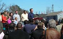 On December 28, 2006, John Edwards officially announced his candidacy for President in the 2008 election from the yard of a home in New Orleans, Louisiana, that was being rebuilt after Hurricane Katrina destroyed it.[62][63] Edwards stated that his main goals were eliminating poverty, fighting global warming, providing universal health care, and withdrawing troops from Iraq.[64]
