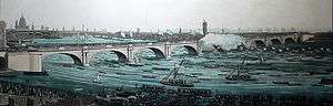 Over the next few years Rennie also attained a deserved reputation as a builder of bridges, combining stone with new cast-iron techniques to create previously unheard-of low, wide, elliptical arches, at Leeds Bridge, and in London at Waterloo Bridge (1811–1817), with its nine equal arches and perfectly flat roadway (thought to be influenced by Thomas Harrison's design of Skerton Bridge over the River Lune in Lancaster). His later efforts in this line also show that he was a skilful architect, endowed with a keen sense of beauty of design. Waterloo Bridge was considered his masterpiece and was the most prestigious bridge project in England, described as 'perhaps the finest large masonry bridge ever built in this or any other country'.[2] The Italian sculptor Canova called it ‘the noblest bridge in the world’ and said that ‘it is worth going to England solely to see Rennie’s bridge.’[3] London Bridge, built from his design by his sons, though not constructed until after his death, replaced the medieval bridge which was proving a serious impediment to the flow of the river and was eventually moved to Arizona. Southwark Bridge (1815–1819) was built as three cast-iron spans over the river. He also designed the Old Vauxhall Bridge.