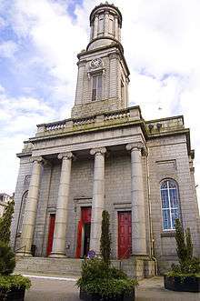 Miller designates Smith's design for the North Church in Aberdeen as "generally considered to be his greatest building"[20] and further states "Undisputedly by far the finest neoclassical church in the City of Aberdeen."[21] Sited on the corner of Queen Street and King Street the design gained approval from the Town Council in September 1828. The church opened in June 1831 but it was years later before sufficient funding was available to install clocks. A Greek Revival style was used in the construction of the 120 feet (37 m) by 62 feet (19 m) rectangular building with a circular pepper pot tower set upon a two-stage box tower. It was the tallest building in Aberdeen until its height was surpassed by the spire of the Triple Kirk designed by Simpson. Suitable to seat 1600 at services, congregation numbers declined and the church closed in 1954. It was used as the Aberdeen Arts Centre from the early 1960s.[15][22]