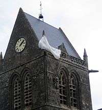 Today, these events are commemorated by the Airborne Forces Museum in Place du 6 Juin in the centre of Ste-Mère-Église and in the village church where a parachute with an effigy of Private Steele in his Airborne uniform hangs from the steeple. Bullet holes are still visible in the church's stone walls. Inside, there are stained glass windows, with one depicting the Virgin Mary with paratroopers falling in the foreground.