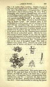 John Templeton's interest in botany began with an experimental garden laid out according to a suggestion in Rousseau's 'Nouvelle Heloise' and following Rousseau's 'Letters on the Elements of Botany'. Here he cultivated many tender exotics out of doors and began botanical studies which lasted throughout his life and corresponded with the most eminent botanists in England Sir William Hooker, William Turner, James Sowerby and, especially Sir Joseph Banks, who had travelled on Captain James Cook’s voyages, and in charge of Kew Gardens. Banks tried (unsuccessfully) to tempt him to New Holland (Australia) as a botanist on the Flinders's Expedition with the offer of a large tract of land and a substantial salary. An associate of the Linnean Society, Templeton visited London and saw the botanical work being achieved there. This led to his promotion of the Belfast Botanic Gardens as early as 1809, and to work on a Catalogue of Native Irish Plants, in manuscript form and now in the Royal Irish Academy, which was used as an accurate foundation for later work by succeeding Irish botanists. He also assembled text and executed many beautiful watercolour drawings for a Flora Hibernica, sadly never finished, and kept a detailed Journal during the years 1806-1825 (both now in the Ulster Museum, Belfast). Of the 12000 algal specimens in the Ulster Museum Herbarium about 148 are in the Templeton collection and were mostly collected by him, some were collected by others and passed to Templeton. The specimens in the Templeton collection in the Ulster Museum (BEL) have been catalogued. Those noted in 1967 were numbered: F1 - F48.[2] Others were in The Queen's University Belfast.[3] Queens University Belfast All of Templeton's specimens have now been numbered in the Ulster Museum as follows: F190 - F264; F290 - F314 and F333 - F334. Templeton was the first finder of Rosa hibernica (1795) and in Ireland of Sisymbrium Ligusticum seoticum (1793), Adoxa moschatellina (1820), Orobanche rubra and many other plants.