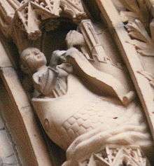 Depiction of Jonah and the "great fish" on the south doorway of the Gothic-era Dom St. Peter in Worms, Germany