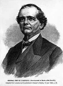 Juarez enlisted Carbajal as general of the Liberal forces.[94] On November 12, 1864, Juarez authorized Carbajal to enlist upwards of ten thousand foreign citizens.[95] Juan Cortina had been in control of Matamoros, and surrendered the city to the French, under the contole of Tomas Mejia.[96] President Abraham Lincoln and Secretary of War Edwin M. Stanton sent General Lew Wallace on a covert operation to assist Carbajal in procurement of arms and ammunition.[97][98] In 1866, Napoleon III withdrew his troops from Mexico.[99][100] Mejia surrendered Matamoros to Carbajal, who was by then Governor and Military Commandant of Tamaulipas.[101] Seizures of churches from French clerics, and forced loans from French-leaning merchants were part of Carbajal's operations.[102] Sebastián Lerdo de Tejada appointed Santiago Tapia[103] to replace Carbajal. The military garrison of Matamoros also rebelled against Carbajal.[104]