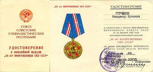 The Jubilee Medal "50 Years of the Armed Forces of the USSR" (Russian: Юбилейная медаль «50 лет Вооружённых Сил СССР») was a state military commemorative medal of the Soviet Union established on December 26, 1967[1] by decree of the Presidium of the Supreme Soviet of the USSR to denote the fiftieth anniversary of the creation of the Soviet Armed Forces. Its statute was amended on three separate occasions, by decrees of the Presidium of the Supreme Soviet of the USSR of February 22, 1968.,[2] of December 19, 1969,[3] and of July 18, 1980.[4]