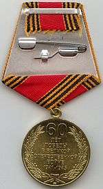 The Jubilee Medal "60 Years of Victory in the Great Patriotic War 1941–1945" (Russian: Юбилейная медаль «60 лет Победы в Великой Отечественной войне 1941–1945 гг.») is a state commemorative medal of the Russian Federation created to denote the 60th anniversary of the 1945 victory over Nazi Germany. It was established on February 28, 2004 by Presidential Decree № 277.[3]
