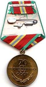 The Jubilee Medal "70 Years of the Armed Forces of the USSR" (Russian: Юбилейная медаль «70 лет Вооружённых Сил СССР») was a state military commemorative medal of the Soviet Union established on January 28, 1988[1] by decree of the Presidium of the Supreme Soviet of the USSR to denote the seventieth anniversary of the creation of the Soviet Armed Forces.