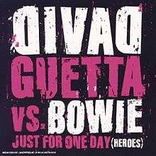 "Just for One Day (Heroes)" is a house song performed by French DJ David Guetta, and featuring vocals from singer David Bowie. The song was released as the lead single from Guetta's compilation album, Fuck Me I'm Famous 2003 in June 2003, and was also credited as the fifth single from his debut studio album, Just a Little More Love. The song contains a sample from Bowie's 1970s track, "'Heroes'". The track was officially credited to 'David Guetta vs. Bowie'. It peaked at No. 73 on the UK Singles Chart in July 2003.[1] The music video for "Just for One Day (Heroes)" can be found on YouTube. It features a group of people partying at a rave, with Guetta performing the track in the background.[2]