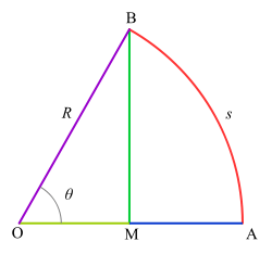 If the radius of the circle is R and the length of arc AB is s, the angle subtended by arc AB at O measured in radians is θ = s / R. The three Indian functions are related to modern trigonometric functions as follows: