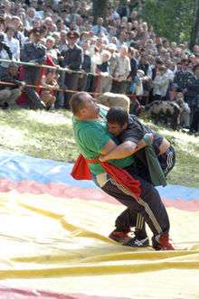 Kurash (kuresh, koresh and variants; Uzbek kurash, Kyrgyz күрөш küröş, Turkmen göreş [1] Bashkir көрәш (köräş), Tatar küreş, күреш, көрәш, kөrəş, Kazakh күрес küres, Shor кӱреш küreş, Azeri güləş, Chuvash кӗрешӳ) is one of the Turkic terms for "wrestling" (from Old Turkic keriš, c.f. Turkish güreş) and specifically refers to a number of folk wrestling styles practiced in Central Asia. The wrestling is the main competition at the folk festival Sabantuy.[2] Wrestlers (köräşçe(lär)) use towels to hold their opponents, and their goal is to throw their opponents off the feet.[3]